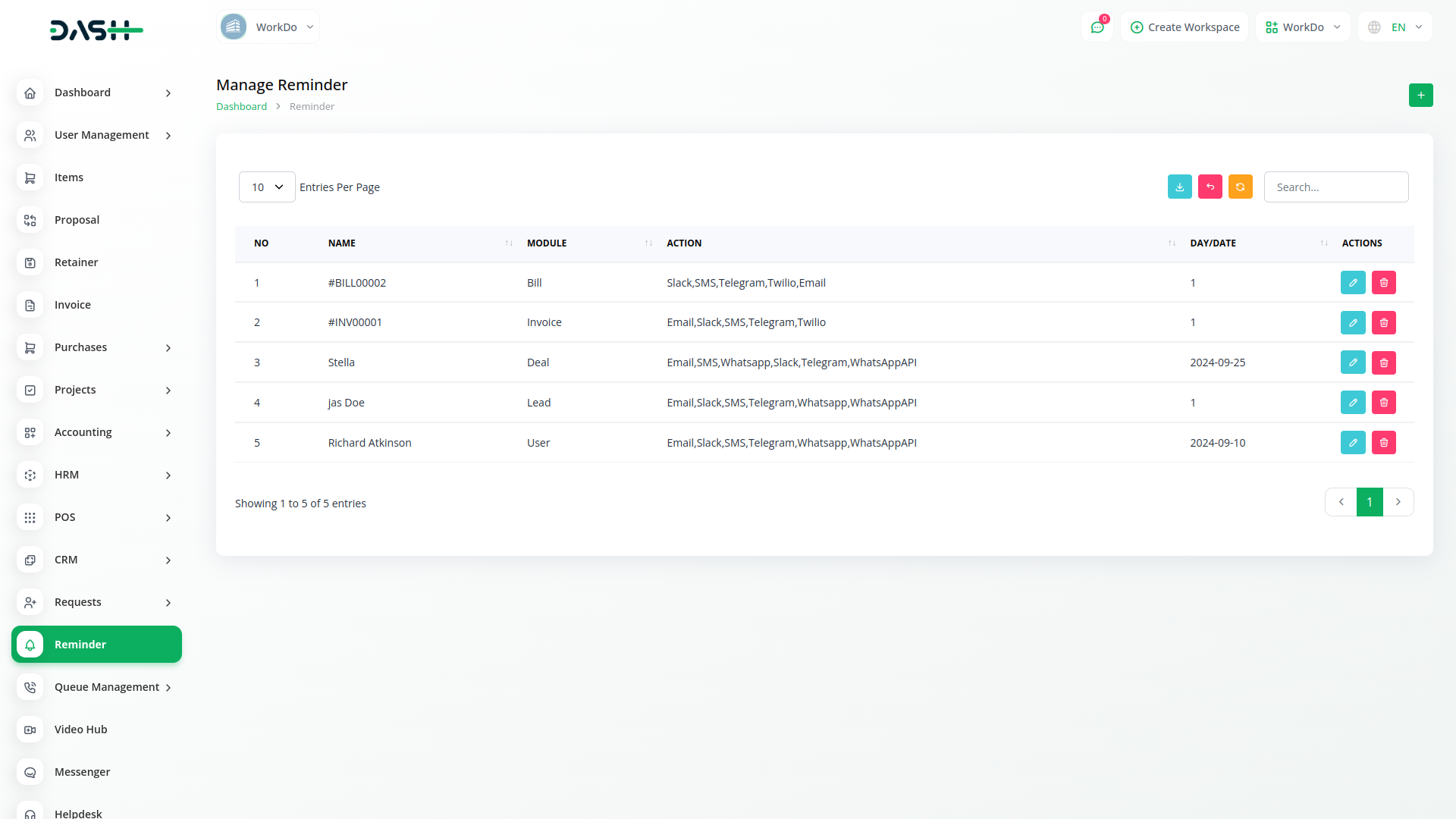 The Reminder Module of Dash SaaS provides a simple yet powerful tool for managing your reminders. With this feature, you can create new reminders as needed and select from various sources through which you want to receive them.