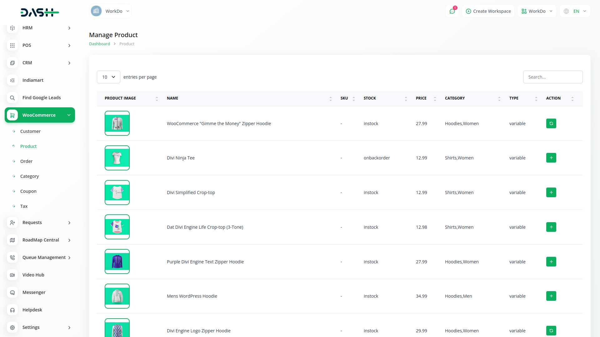 Integrate and manage your store`s products and inventory with WooCommerce using WooCommerce. Simplify product and coupon management while enhancing customer interactions for an optimized WooCommerce experience.You can also add your woocommerce products to dash saas by clicking on the button given beside the product.
