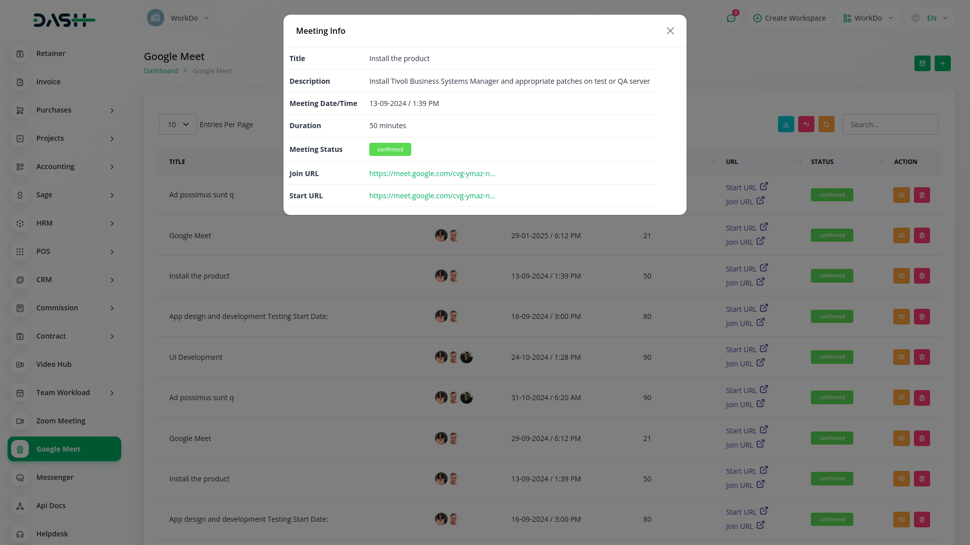 Empower your team with the ability to create and schedule Google Meet sessions instantly from within Workdo-Dash. Simplify your virtual meeting experience by seamlessly generating Google Meet links, enhancing team collaboration and communication.